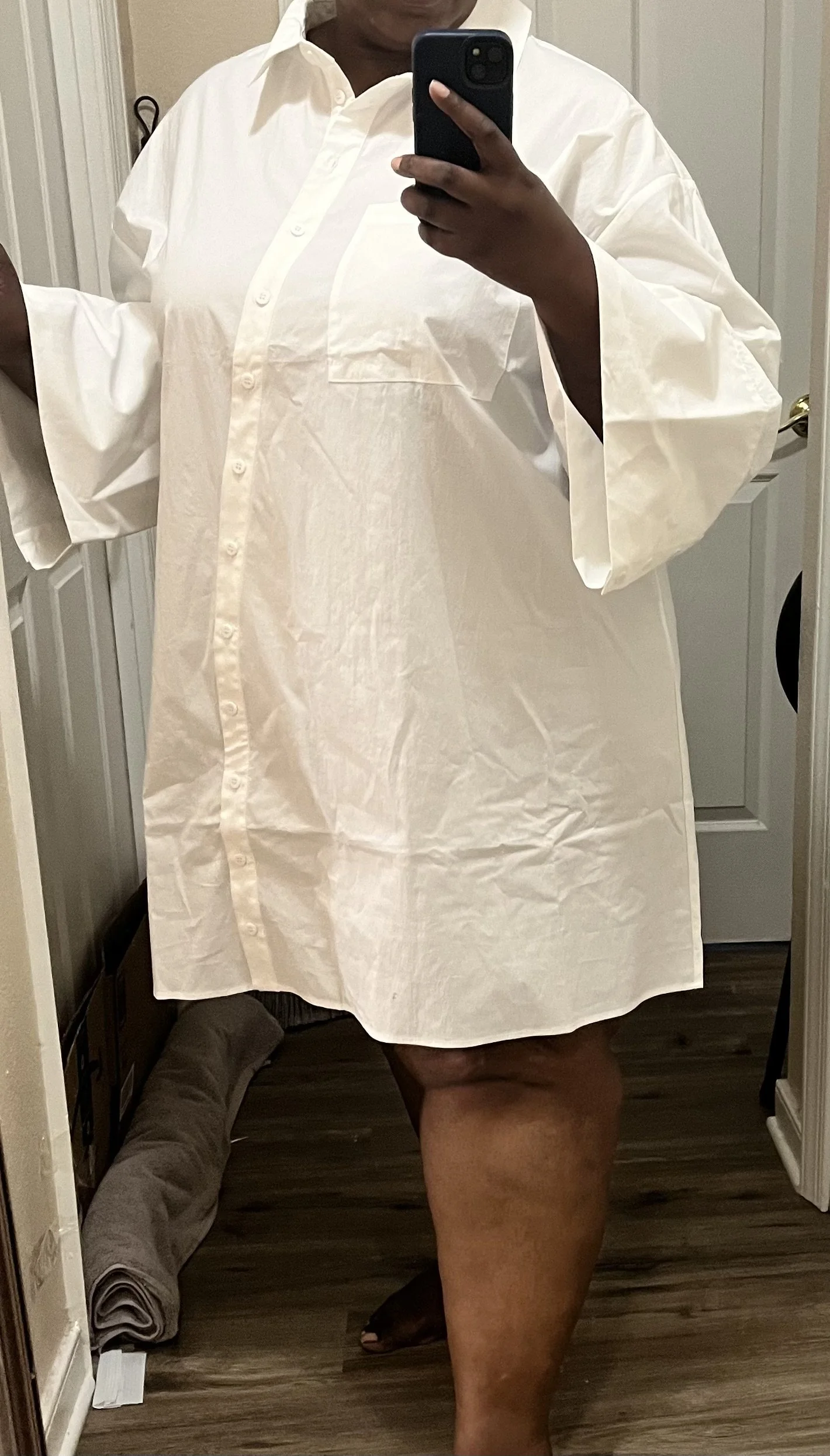 I loved the original Eloquii, owned by Limited Brands. I learned to like the second rendition of the brand, but I always felt it catered to younger and more trendy dressers. Today, the brand is own by the same company that own's Catherine's among other brands. When I learned of the merger, I thought it was odd. These are two totally different populations. I immediately noticed the differences in the clothing, the price (or promotions) as well as the logistics (shipping). Going forward, I don't anticipate buying much from them, but had a few things I already wanted to try. This is a mini shirtdress. I have never been a mini-dress girl, not even when I was thin. I love the sleeve. My intention was to wear this as a shirt. Since I've tried it on, I think that I'm willing to try it as a dress with leggings and booties. I accidentally bought the green and decided to keep it also. What I don't like about this dress is the weird button seam. For some reason they designed it off center. From the model in the photo, I couldn't tell if it was on purpose or the way she was posing. It's weird, but I can live with it.